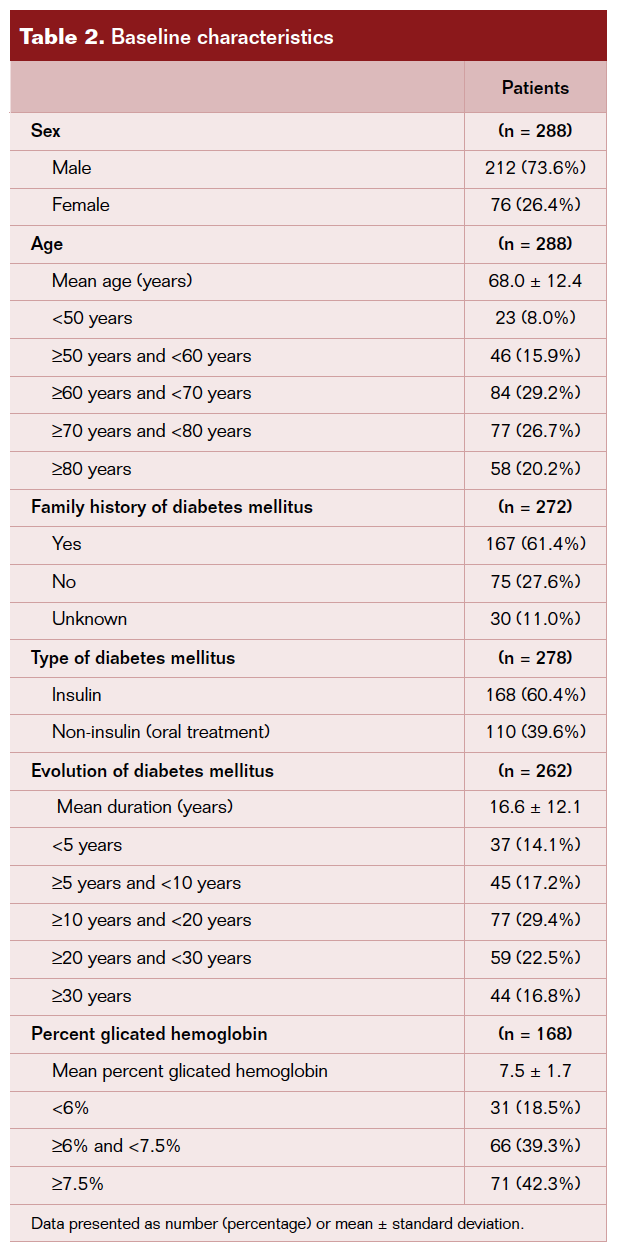 The relationship between DF complications and poor control of cardiovascular risk factors is known. Striking data in our population include the high percentages of patients with hypertension, dyslipidemia, ischemic heart disease, and retinopathy. These data give us an idea of the medical complexity of these patients, and the subsequent difficulty in carrying out complete follow-up in all study patients, which is reflected in some incomplete data in our results. One of the most important factors in the development of this pathology is the time of exposure to the disease. The mean time of evolution of DM is >16 years in our patient population. We cannot ignore the poor general control of glycemia and the low cultural level of the study population, which are recognized risk factors in the diabetic patient.19