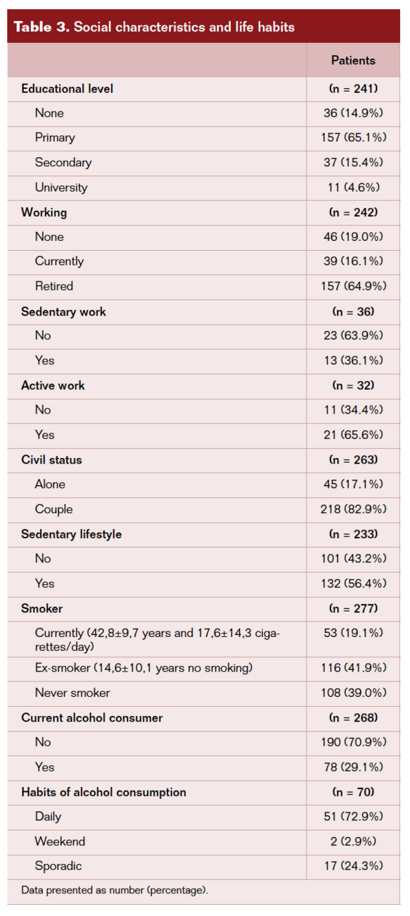 A follow-up of 288 patients was performed, including a total of 5205 visits (18.1 ± 19.9 visits). The average duration of follow-up was 509 ± 309 days and median duration was 485.5 days. Baseline characteristics are shown in Table 2. Social characteristics and life habits are presented in Table 3.