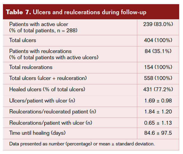 During the study period, 239 patients (83.0%) had at least 1 ulcer; 217 had an ulcer on their first visit, while 22 developed it during the follow-up period. The digital location was the most common (64.9%), followed by metatarsal (25.7%), heel (18.8%), and midfoot (7.3%). The total number of ulcers treated was 404 (1.69 ± 0.98 ulcers per patient). In 84 of the 239 patients with ulcers (35.1%), there was at least 1 reulceration during follow-up. A total of 154 reulcerations were treated (1.84 ± 1.20 per patient with reulceration and 0.65 ± 1.13 per patient with ulcer). If all ulcers were taken into account (ulceration + reulceration), 558 lesions were treated (Table 7).