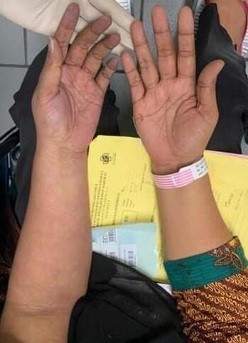 A 47-year-old woman was admitted to the ED of RSUD Dr. Soetomo with pain in her left hand that had been blue for 1 day before admission. The pain was felt on the tip of the hands and palms. The complaint was accompanied by a change in skin color to dark blue, a numb left hand up to the left elbow, and a chilly sensation in the left hand. The discomfort was unaffected by activity. The patient expressed frustration at how challenging and heavy it was to move the fingers on the left hand. She reported having shortness of breath 3 days before admission and cough, weakness, dizziness, and fever for the past 10 days. The patient was confirmed to be COVID-19 positive with a polymerase chain reaction swab at admission. She had a history of uncontrolled diabetes and toxic nodular goiter euthyroid phase; she also had normal blood pressure, did not smoke, and had no history of trauma.
