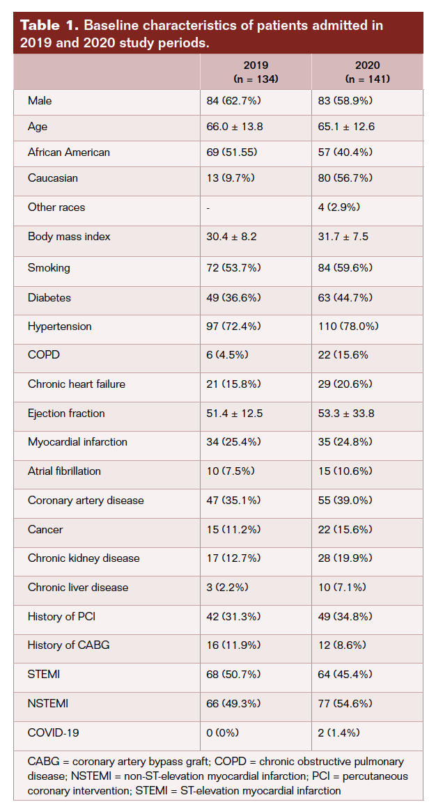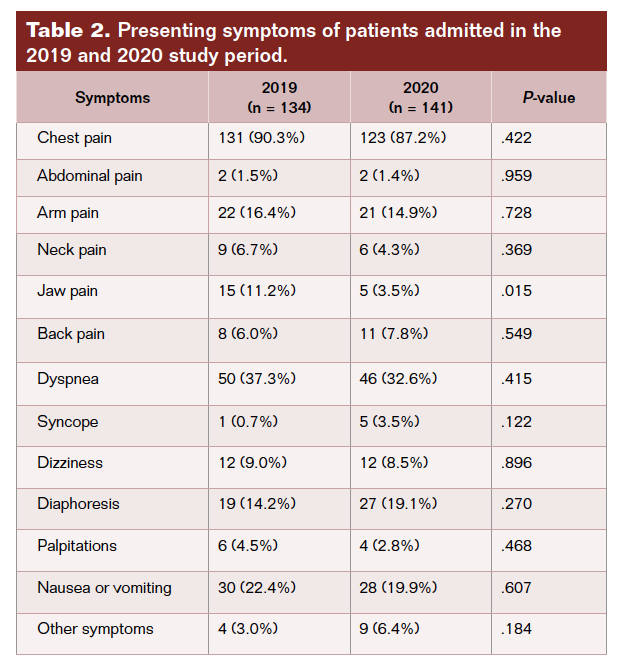 During the study period of March through December 2019 and 2020, 275 MI admissions met our inclusion criteria (265 single encounters and 10 duplicate encounters). We had 141 encounters in 2020 and 134 encounters in 2019. There were 132 (48%) encounters with STEMI (50.7% in 2019 and 45.4% in 2020). There were 143 (52%) encounters with NSTEMI (49.3% in 2019 and 54.6% in 2020). The mean age of patients was 65.1 ± 12.6 years in the 2020 group vs 66.0 ± 13.8 years in the 2019 group. Most patients were Caucasian (56.7% in the 2020 group vs 51.5% in the 2019 group). Mean body mass index in the 2020 group was 31.7 ± 7.5 kg/m2, and 30.4 ± 8.2 kg/m2 in the 2019 group. The baseline EF before admission was 53.3 ± 33.8 in the 2020 group and 51.4 ± 12.5 in the 2019 group. Two patients tested positive for COVID-19 in the 2020 group. Most baseline characteristics were comparable in both groups except for diabetes (44.7% in 2020 vs 36.6% in 2019), COPD (15.6% in 2020 vs 4.5% in 2019), and chronic kidney disease (19.9% in 2020 vs 12.7% in 2019). Further details about the baseline characteristics of the included patients are shown in Table 1. There were no significant differences in the presenting symptoms of patients included in our study except for jaw pain (3.5% in 2020 vs 11.2% in 2019, P=.015), as shown in Table 2.