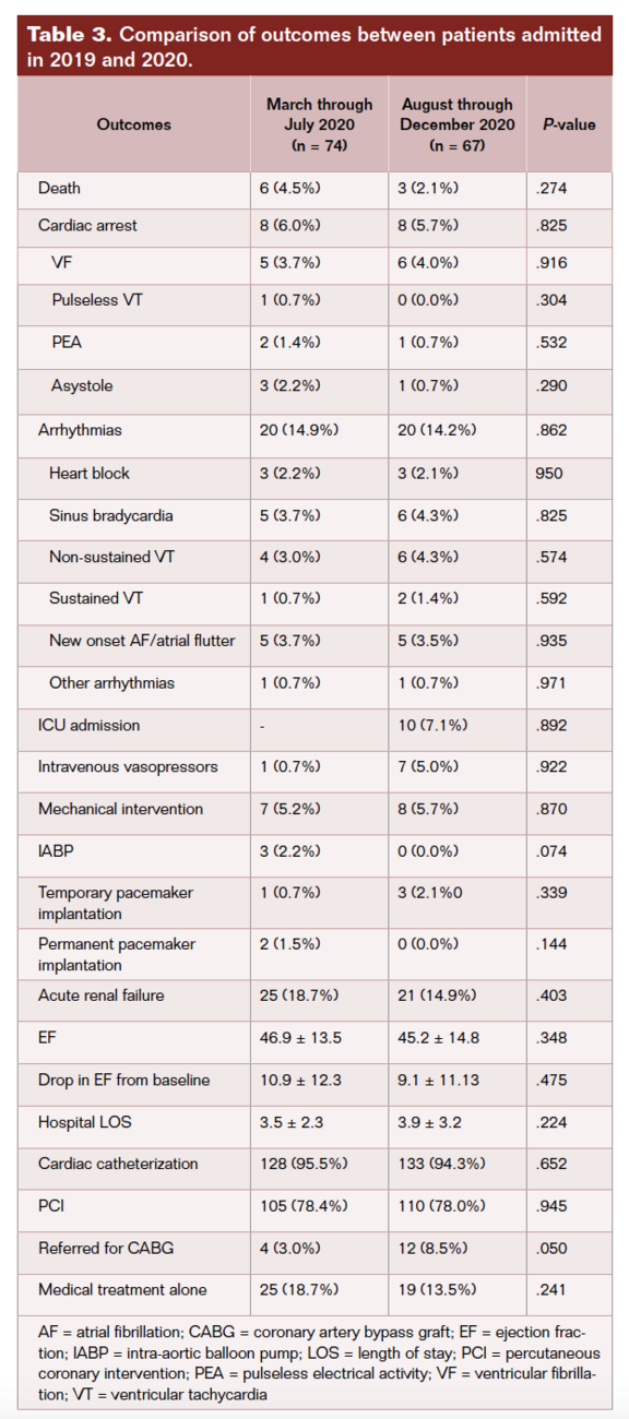 In conclusion, the outcomes MI during the pandemic were not different in our hospital compared with an equivalent time from the prior year, although the referrals for CABG surgery were higher. The first 5 months of the pandemic were associated with a decrease in pursuing cardiac catheterization along with an increase in medical treatment alone compared with the following 5 months.