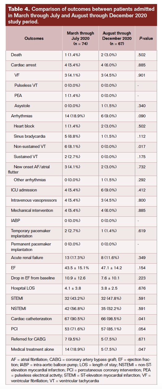 When comparing encounters in the first 5 months of the pandemic (March through July) with encounters in the last 5 months of the pandemic in 2020 (August through December), there were no significant differences in mortality (1.4% vs 3.0%, P=.502), cardiac arrest (6.0% vs 5.4%, P=.885), acute renal failure (17.3% vs 11.6%, P=.349), ICU admissions (5.4% vs 9.0%, P=.412), EF after admission (43.5 ± 15.1 vs 47.1 ± 14.2, P=.154), and LOS in the hospital (4.1 ± 3.8 vs 3.8 ± 2.5, P=.676). There was a significant increase in the rates of non-sustained ventricular tachycardia (NSVT) in encounters in the first 5 months of the pandemic compared with encounters in the following 5 months (8.1% vs 0.0%, P=.017) without a significant difference in the overall rate of arrhythmias (18.9% vs 9.0%, P=.090). There was a significant decrease in the rates of cardiac catheterization (90.5% vs 98.5%, P=.041), and a significant increase in the rates of medical treatment alone (18.9% vs 7.5%, P=.047) when comparing encounters in the first 5 months (March through July) with encounters in the following 5 months (August through December) of the pandemic in 2020 (Table 4).