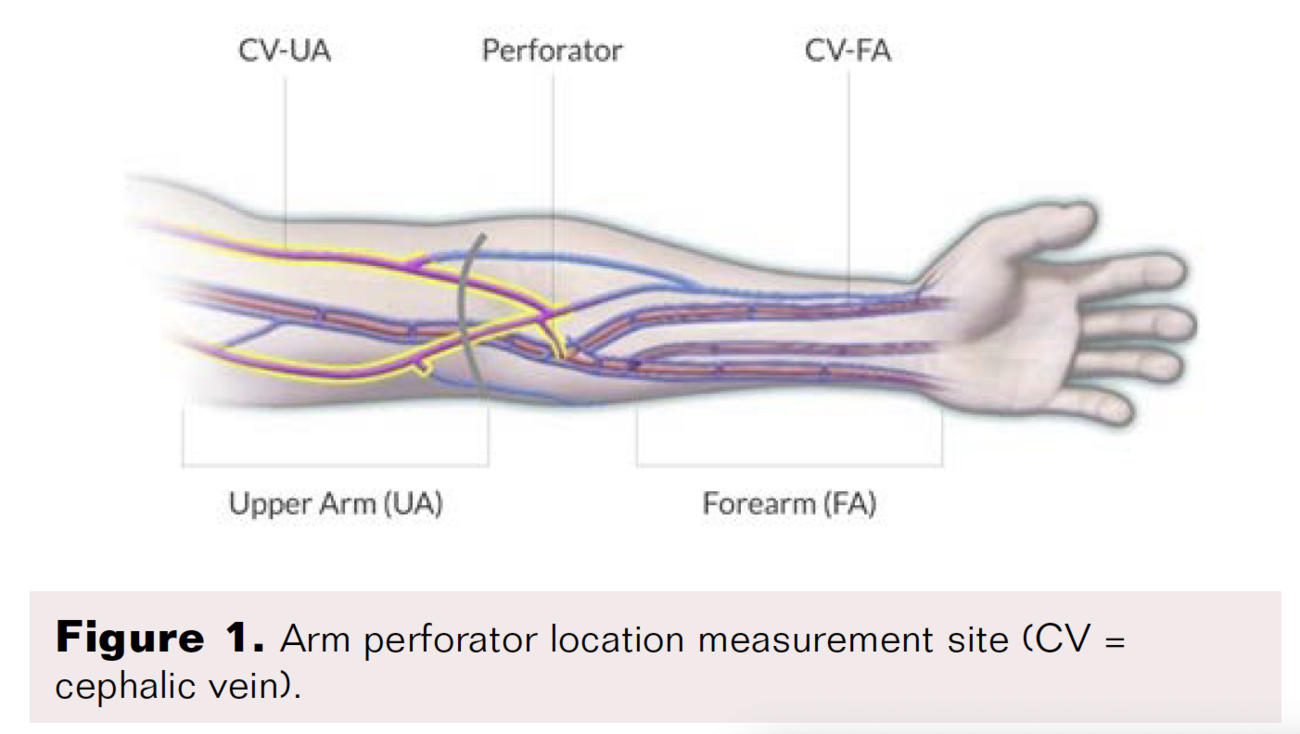 The FACT trial was a large, 3-center trial designed to understand the role of a novel pneumatic device to help enlarge superficial arm veins in CRF patients. A subset of the study was perforator vein measurements done on 19 patients. In addition to sAVF, endoAVF is now an acceptable form of fistula creation, with 2 devices on the market globally. EndoAVF adoption and use creation is limited by many factors, including inadequate veins.12 An enlarged perforator vein is the key to consistent, successful endoAVF placement, which is the focus of this study. This trial is the first time the perforator vein has been proven to dilate using a novel intermittent pneumatic compression device.