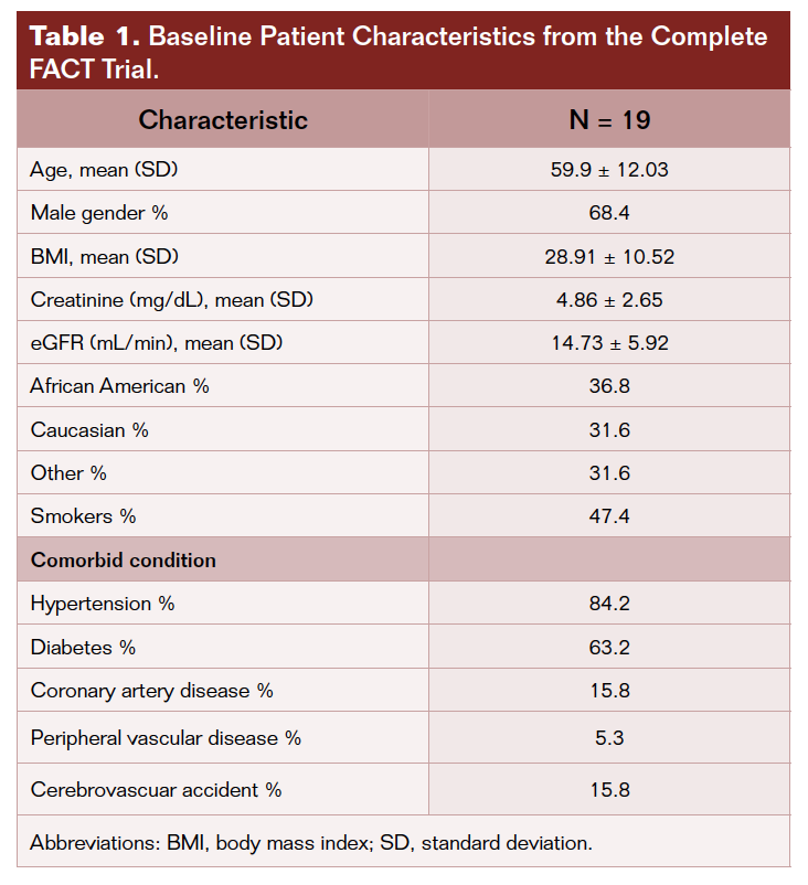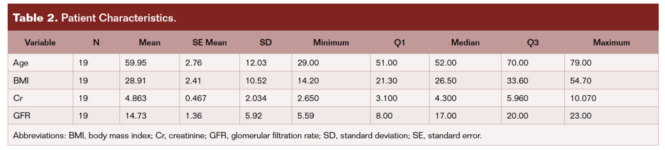 Medical records of enrolled patients were reviewed to collect gender, date of birth, height, weight, ethnicity, and medical history related to factors that may affect vascular health, including, but not limited to, dialysis history, diabetes, hypertension, coronary artery disease, peripheral vascular disease, medication history, and any other factors that contribute to vascular health (Table 1 and Table 2). All patients had renal function measured by serum creatinine and calculated eGFR.