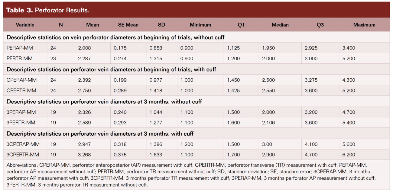 The AP measurements of the perforator vein (3CPERAP-MM vs. CPERAP-MM) increased from an average of 2.342 mm ± 0.966 mm at baseline to 2.947 mm ± 1.386 mm and produced a t-statistic of t = 3.32, P-value = .002. This was found to be highly significant when compared with the chosen level of significance. The TR measurements of the perforator vein (3CPERTR-MM vs CPERTR-MM) similarly increased from an average of 2.716 mm ± 1.481 mm to 3.268 mm ± 1.633 and produced a t-statistic of t = 2.66, P-value = .008. This was also found to be highly significant when compared with the chosen level of significance.