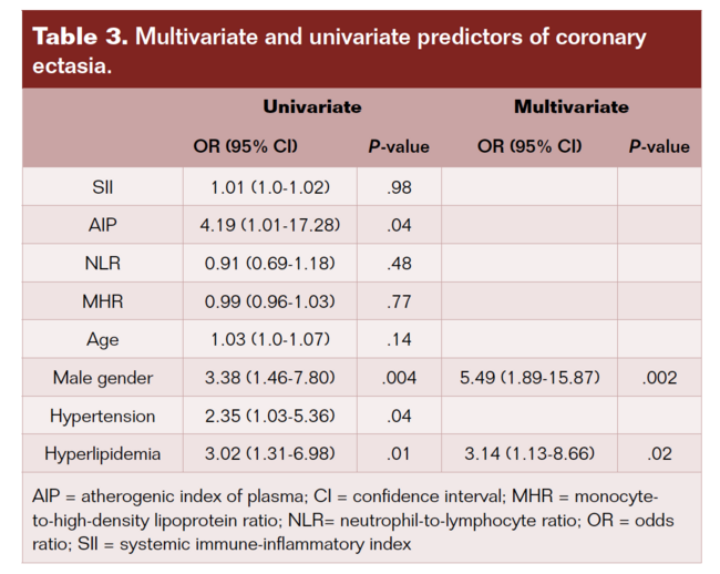 The clinical and demographic features, and laboratory information of the study groups, are shown in Table 1 and Table 2, respectively. Patients with CAE had a higher prevalence of HTN, HL, and male gender. In addition, frequency of DM and age were similar between the groups. AIP levels were significantly higher in the CAE group, whereas SII, MHR, and NLR levels were similar between the groups. Whole laboratory measurements also were similar between the groups, except for triglyceride levels. Univariate and multivariate logistic regression analysis results according to CAE are shown in Table 3. The following variables were used in analysis: HTN, age, HL, male gender, SII, MHR, AIP, and NLR. Among these variables, male gender (OR 5.49, 95% CI 1.89-15.87; P=.002) and HL (OR 3.14, 95% CI 1.13-8.66; P=.02) were identified as independent predictors of CAE.