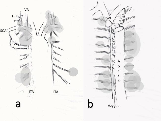 Abbreviations: AVF, arteriovenous fistula; AVM, arteriovenous malformation; ICA, intercostal artery; IMA, internal mammary artery; ITA, internal thoracic artery; SCA, subclavian artery ; NA, not applicable; N, not detected; PA, pseudoaneurysm; VA, vertebral artery.