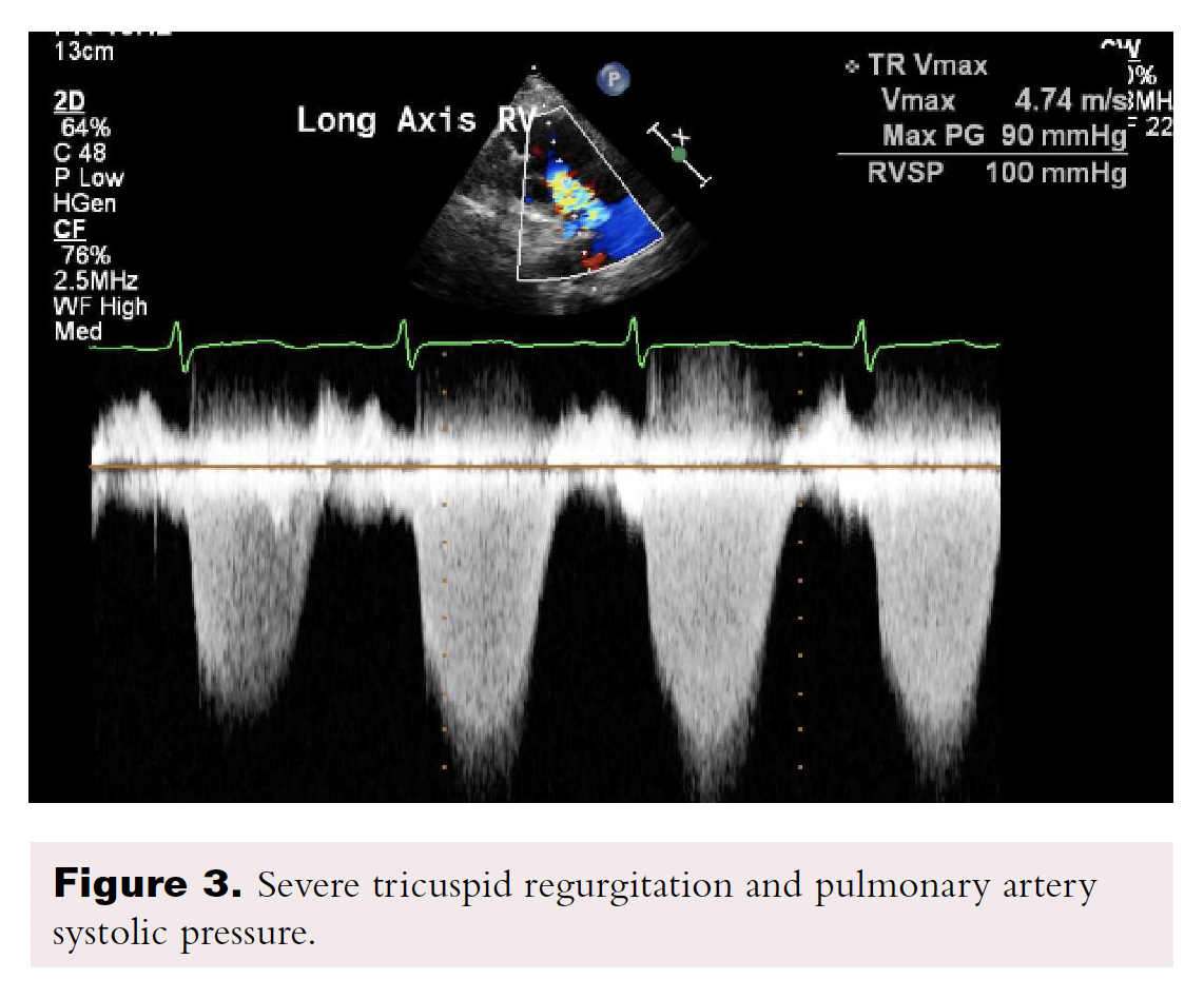 Transthoracic echocardiography showed severe dilated right chambers. There was a large, highly mobile right atrial thrombus (Figure 2), with severe systolic right ventricular dysfunction: severe tricuspid regurgitation and pulmonary artery systolic pressure of 100 mmHg (Figure 3).