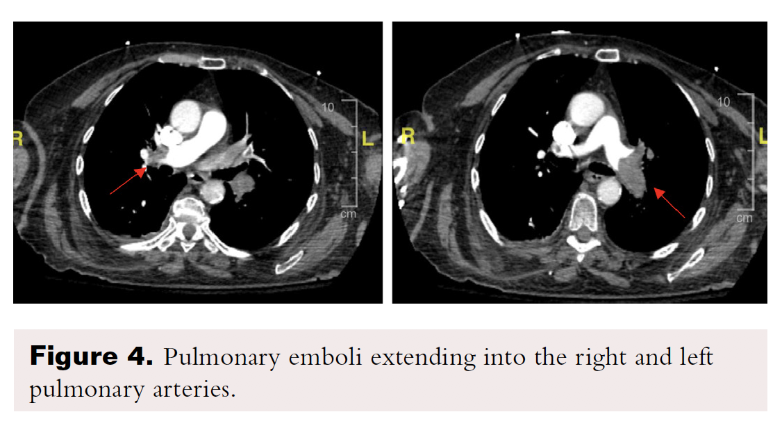 A PE protocol computed tomography angiography revealed inversion of the ventricular ratio with straightening of the interventricular septum compatible with right ventricle strain. Pulmonary emboli extending into the right and left pulmonary arteries with partially occluded filling defects extending into all lobes (Figure 4).