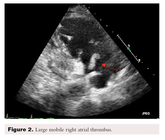 Two types of RHT have been described. Type A thrombi are visualized in transit within the right cardiac cavities, morphologically serpiginous, highly mobile, and associated with PE. Type B thrombi are not mobile, formed in situ and are associated with underlying cardiac abnormalities. Based on the TTE images, this patient had a Type A thrombus.1,2,3