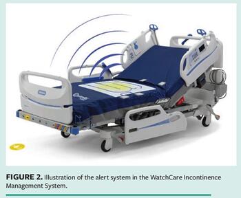 This incontinence management system uses sensor technology installed under the surface of a hospital bed (Figure 2). The sensors communicate wirelessly with a smartpad. The smartpad has all the necessary functionality of a breathable, high-absorbency, moisture-wicking underpad but with the added benefit of embedded moisture-detecting technology. Once the smartpad detects the presence of an incontinence event, it communicates back to the sensors in the bed. The bed initiates a discrete visual alert to the care team by lighting up at the foot of the bed and through the nurse call system. These alerts allow the caregiver to be aware of when an incontinence event has occurred and address it through prioritized care as quickly as possible.