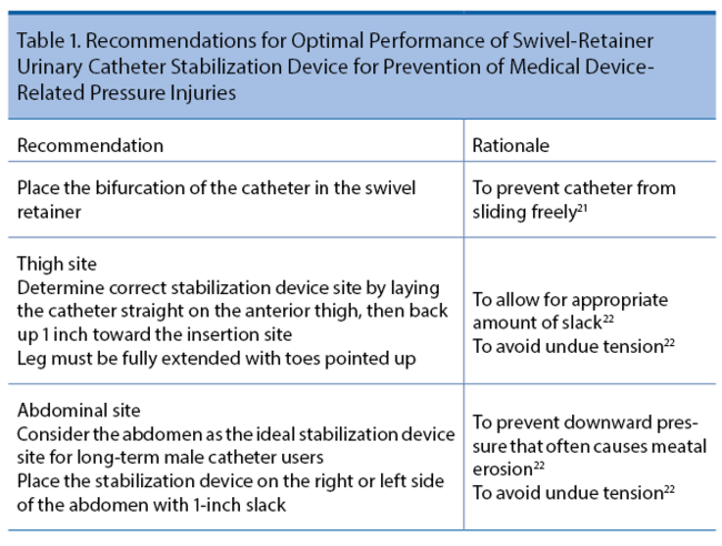 Thorough assessment is essential in the prevention of urethral trauma.4,7,8 The urethral meatus on all sides of the catheter tube should be assessed at least every 12 hours by a registered nurse (RN).12,14,20 Small urethral trauma can progress to deep penile injuries in a short time.9 In the case of this patient, the deeper injury occurred within 1 week of the discovery of the penile pressure injury. While assessing the skin of the penis, the RN should also assess the securement device to ensure the catheter is being correctly stabilized.1,12 The manufacturer of the swivel retainer urinary catheter provides recommendations and rationales for correct use of their product (Table 1). Manufacturers of other catheter securement devices have similar recommendations. One manufacturer of a leg band catheter securement device recommends securing the catheter to the inner thigh and leaving an ample loop above the band to prevent traction on the catheter.23 The instructions further state the leg band can be rotated and secured on alternating lower extremities to prevent irritation to the urinary meatus and promote patient comfort.23 The manufacturer instructions for a nonswivel adhesive-backed anchoring catheter device state the device should be placed on the upper thigh with the leg fully extended, leaving 1 inch of slack between the device and the urinary meatus.24