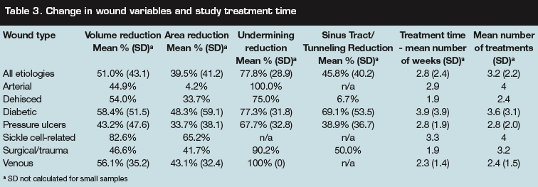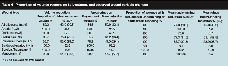 In the same timeframe, the proportion of wounds responding and the amount of the response for all etiologies included: in 58 out of 65 (89.2%) of the wounds, volume decreased 62% (SD 30.5), in 55 out of 65 (84.6%) area decreased 50.9% (SD 32.1), and in 23 out of 23 (100%) of the wounds with undermining and/or ST/T was reduced 77.8% (SD 28.9) and 45.8% (SD 40.2), respectively (see Table 4). No systemic or wound site side effects were noted. Occasionally, maceration around the periwound was noted if that tissue was not protected with moisture barriers or if the dressings were not changed according to directions. Only two of 65 wounds either increased in size or remained unchanged. In the patient with sickle-cell disease, wound volume decreased 82.6% and in the two patients with arterial disease wound volume decreased 65.2% with four treatments.