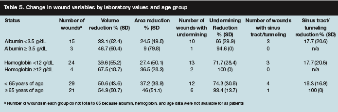 Patients with low albumin levels (<3.5 g/dL), in 11 out of 15 (73.3%) average wound volume decreased 64% (SD 35.1) in 1.7 weeks (SD 0.9) with 3.2 treatments (SD 1.3). In 19 out of 24 (79.1%) patients with low hemoglobin (<12 g/dL), average volume decreased 64.4% (SD 30.8) in 2.1 weeks (SD 1.0) with 3.4 treatments (SD 1.5). In 17 out of 21 (81%) patients ≥65 years, average volume decreased 74.4% (SD 31) in 3 weeks (SD 3.0) with 3.3 treatments (SD 2.7)