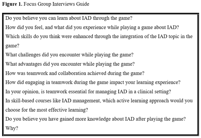 Qualitative phase of the study. For the qualitative data of the research, semi-structured questions and focus group discussions (FGDs) were conducted by one of the researchers, a CWON, using a phenomenology methodological approach. Before the start of the study, this CWON did not engage with students. The students had not been informed about the interviewer before. In line with the literature,21 researchers prepared FGD questions for post-game interaction to comprehensively determine students' emotions and thoughts during the game interaction (Figure 1). Five FGDs were conducted with a total of 32 students. Each FGD consisted of 6 or 7 participants. The students were assigned to the focus groups in a randomized manner using https://www.randomizer.org. In the literature, it is recommended that focus groups should ideally consist of a minimum of 6 and a maximum of 11 individuals to achieve a sufficient sample size.26