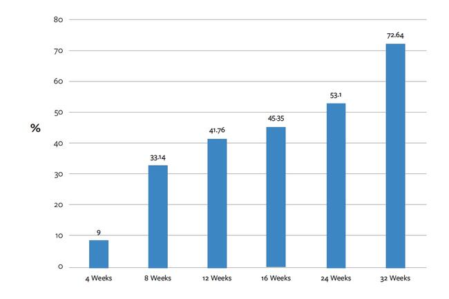 The frequency of wound closure was 33% by week 8 and continued to increase at every study visit through week 32 (Figure 1). Wound closure frequencies were 42%, 45%, 53%, and 73% at weeks 12, 16, 24, and 32, respectively, with a median time to wound closure of 22 weeks. For all 67 of these PCMP-treated VLUs, the incidence of achieving greater than a 60% reduction in baseline area and depth were 78% and 70%, respectively, with approximately 87% showing reduction of greater than 75% in volume (Figure 2).