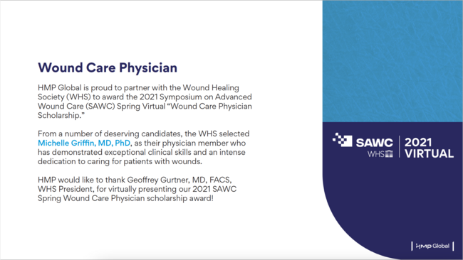 HMP would like to thank Geoffrey Gurtner, MD, FACS, WHS President, for virtually presenting our 2021 SAWC Spring Wound Care Physician scholarship award!