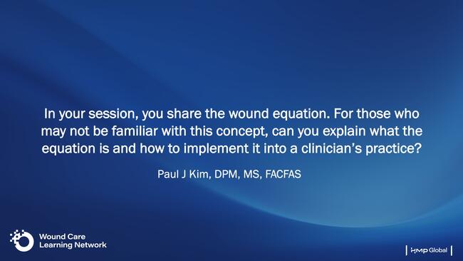 Paul J Kim, DPM, MS, FACFAS, FAPWH, explains the core concepts of the wound equation and how the equation is implemented in a clinician’s practice.