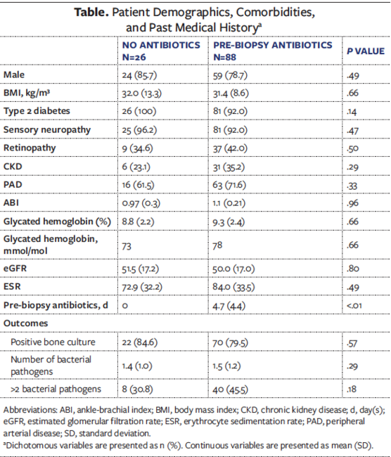The majority of studies that discuss antibiotics and bone culture yield are from patients with hematogenous VO.1 The results of these studies have been generalized to other types of bone infections that occur from direct extension, such as DFO. The aim of the current study was to evaluate the effect of antibiotic exposure and bacterial pathogen identification in patients with DFO. The null hypothesis was that bacterial culture identification would be the same in patients who did not receive pre-biopsy antibiotics and patients who received pre-biopsy antibiotics.