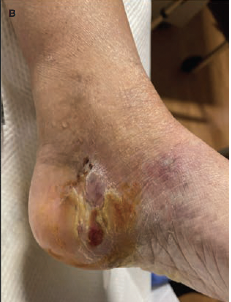 A 64-year-old female presented with an increasingly enlarging wound on the medial aspect of her left heel. She noted no clear etiology for the wound, denying any accident, injury, trauma, or shoe irritation. She had been self-managing the wound with conservative treatments, including topical antibiotic and dry sterile dressings for several weeks without improvement. Past medical history was significant for mild peripheral arterial disease (PAD) with previous stent placement of bilateral iliac arteries (right toe brachial index [TBI] of 0.87 and ankle-brachial index [ABI] of 0.96, and left TBI of 0.65 and ABI of 0.95, with triphasic flow noted to bilateral dorsalis pedis and posterior tibial pulse) and type 2 diabetes mellitus, with the most recent A1c of 5.5%. She was a former 22.5 pack per year smoker and had quit smoking 10 years prior to the onset of this wound. Her diabetes was treated with dapagliflozin 10 mg daily and dulaglutide 0.75 mg once weekly. She was medically managed for her PAD with clopidogrel 75 mg daily, rosuvastatin 40 mg daily, and cilostazol 50 mg twice daily.
