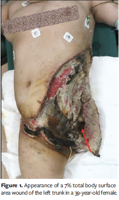 Upon transfer to the authors’ facility 41 days after the accident, the patient presented with a 7% TBSA wound of the left trunk (Figure 1) and a 1% TBSA pressure ulcer on the lower back. Her condition remained stable at the time of admission. Laboratory test results were as follows: WBC count, 6.73×10⁹/L (reference range, 4.0×10⁹/L–10.0×10⁹/L); Hb, 126.0 g/L (reference range, 120.0 g/L–180.0 g/L); serum albumin level, 25.6 g/L (reference range, 40.0 g/L–55.0 g/L); prealbumin level, 0.09 g/L (reference range, 0.2 g/L–0.4 g/L); PCT level, 0.147 ng/mL (reference range, <0.05 ng/mL); and HbA1c, 6.5% (reference range, 4.0%–6.0%). Physical examination revealed breakdown of the rectus muscle, external oblique muscle, and internal oblique muscle of the left abdominal wall. A portion of the peritoneum and the left pelvis were exposed within the wound.