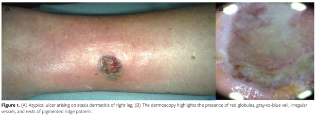 Squamous cell carcinoma and basal cell carcinoma are the most frequent subtypes of cancers associated with skin ulcers and SD.1,2 Lymphomas and other cancers have also been described in skin stasis of the lower limbs.3 Despite this, such circumstances are uncommon.1 Achromic melanoma is a rare form of pigmentless melanoma, and it is most frequently located on the sole of the foot. Ulcerated achromic melanoma of the lower limbs can be easily confused with a vascular wound, representing an important dermatological pitfall. Diagnosis is often delayed and is associated with a poor prognosis.4