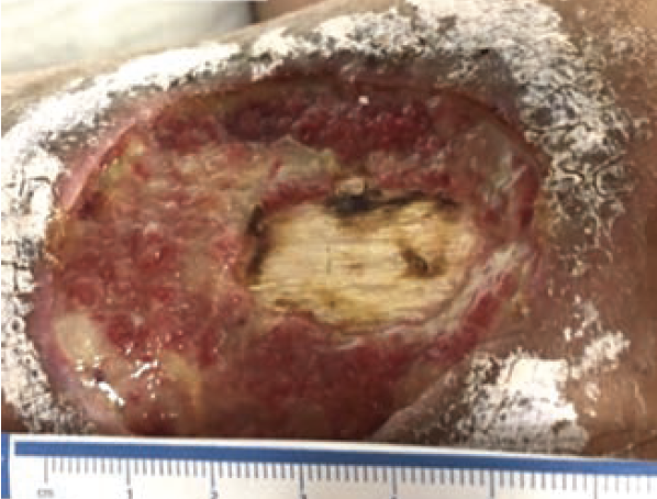 A 29-year-old male with poorly differentiated angiosarcoma and spindle cell sarcoma presented with a complicated left leg wound and exposure of the left tibia. The tumor had been noted for approximately 10 years prior to presentation. Seven months before presentation, the first course of aggressive chemotherapy and neoadjuvant radiotherapy was initiated, after which his malignancy was removed with appropriate margin. No evidence of osteomyelitis was present, and no prophylactic antibiotic treatment was utilized. Bone integrity was not in question; there were no indications for inflammatory marker or radiographic imaging diagnostic bone studies.6,7 Two weeks after tumor removal (2 months prior to presentation), split-thickness skin graft reconstruction protected by NPWT was attempted; however, the graft did not take, and the thin layer of soft tissue desiccated, exposing periosteum-denuded bone. Due to the patient’s ongoing radiotherapy and immunotherapy schedule and compromised immune system, previously planned invasive flap surgery was delayed. To stabilize the enlarging wound with progressively desiccating edges, an advanced biologic (dehydrated human amnion/chorion membrane) was applied, but the wound condition did not improve. The patient’s nutritional status was monitored by oncologists with comprehensive metabolic panels reviewed every 3 to 4 weeks. The only abnormality observed was a low cortisol level on 3 different occasions, attributed to mild immunotherapy-induced adrenal insufficiency. Patient consent for the publication of case images and results was obtained.