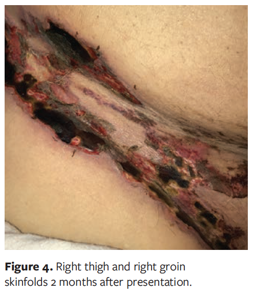Six days later, the patient was readmitted to the hospital for chest pain, hypotension, and concern for septic shock. Norepinephrine infusion was begun and continued for 2 days. The affected areas of the abdominal skinfold and right and left groin were evolving with eschar, tan drainage, and malodor (Figure 4 and Figure 5). Moist-to-moist dressing changes with quarter-strength sodium hypochlorite (0.125%) solution were initiated, after which the wound care plan was changed, adding collagenase to areas of dry eschar and covering all wounds with dressings moistened with quarter-strength sodium hypochlorite (0.125%) solution. The sodium hypochlorite solution was continued temporarily as a topical antiseptic to manage bacterial bioburden.³ Collagenase was used to keep the wound bed moist and promote enzymatic debridement until surgical debridement could be completed. With investigational use of both products prior to implementation, it was confirmed that collagenase and sodium hypochlorite could be safely used together.⁴