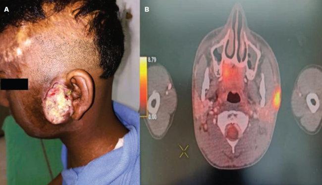 MU is a rare cutaneous squamous cell carcinoma that occurs in long-standing unstable scar tissues and areas of chronic inflammation, such as post-burn scar. The incidence of MU has been reported to range from 0.77% to 2%.1 The mean latent period between burn scar and onset of malignancy is 28 years.2 Following the initial insult, repeated low-grade trauma and incomplete wound healing are the possible precipitating factors for malignant transformation. Surgical resection followed by adjuvant therapy is the treatment of choice for MU. The current case report discusses a rare case of MU metastasizing to the parotid gland, with an aggressive clinical course.
