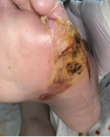 A 69-year-old female with history of seizure disorder, poorly controlled diabetes, hypertension, dyslipidemia, and migraine headaches presented to the emergency room with altered mental status secondary to sepsis from severe diabetic foot ulcer on the left foot. Abnormal vital signs on presentation included tachycardia and tachypnea. The patient received a fluid bolus and broad-spectrum antibiotics immediately upon arrival. Podiatry was consulted for evaluation of the lower extremities. The patient reported noticing an open wound on the bottom of her left foot 2 weeks prior, with worsening redness and swelling extending up the leg over the past week. The patient did not recall any trauma but admitted to lack of protective sensation in her lower extremities. Despite this, she acknowledged feeling disproportionate pain in her left foot during ambulation. The patient also reported having an asymptomatic wound to the right hallux.