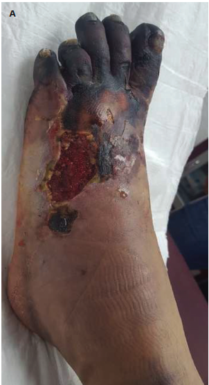 Two months after initial debridement and drainage, partial salvage of the first toe and several phalanges was achieved; however, a large ulcer persisted, affecting both the dorsal and the plantar aspect of the foot (Figure 2A, 2B).