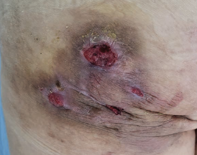 A 65-year-old male with hypertension and diabetes was admitted to the hospital for treatment of refractory cellulitis despite 8 months of aggressive treatments. Ten months prior to this latest admission, an erythematous induration of unknown origin appeared on his left buttock; the lesion was initially approximately 5 cm × 5 cm, but it was left untreated. After 2 months, the lesion developed into an 18-cm × 15-cm inflammatory lesion with symptoms of blistering and rupture. The patient received antibiotic medication and underwent 3 incision and drainage procedures at another clinic, as well as 2 more incision and drainage procedures at another general hospital over a period of 8 months. Despite multiple attempts at management, the lesion recurred, and symptoms showed no signs of improvement.
