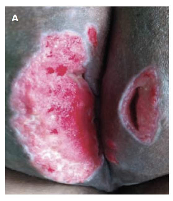 Skin graft was indicated based on the extensive wound area. However, the treating clinicians chose open wound care to promote healing with secondary intention based on the patient’s comorbidities (obesity), the patient’s refusal of skin graft, and the availability of a good wound care facility at the authors’ center.