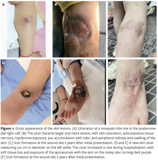 In October 2020, a 7-year-old female was admitted to the hospital owing to multiple skin ulcerations on the bilateral lower limbs. The parents reported that 1 month prior, after being bitten by mosquitoes, the child developed a scattered rash on both lower limbs accompanied by itching and discomfort. While some of the rashes healed, others gradually expanded and developed into ulcers with redness, swelling, and suppuration (Figure 1A). The patient also experienced intermittent fever, with a maximum temperature of 40°C, accompanied by sneezing and catarrh symptoms that did not respond to antibacterial therapy. She had no history of hepatitis, tuberculosis, malaria, surgery, trauma, blood transfusion, or food or drug allergy. Four years prior, the patient experienced facial edema, conjunctival congestion, and various skin allergies that resolved following symptomatic treatment.