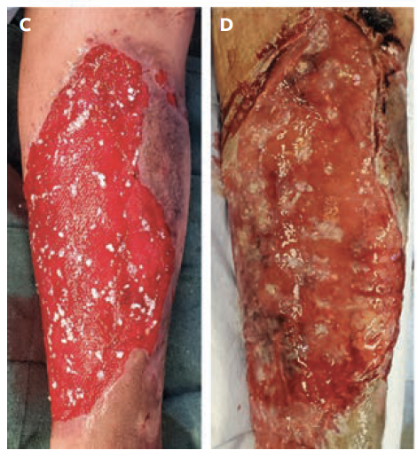 The patient was taken to the operating room and underwent debridement of the wound, resulting in a final wound dimension of 25 cm × 20 cm, after which a dermal regeneration template (Integra Dermal Regeneration Template, Integra LifeSciences) was applied. Because of concern regarding the patient’s ability to heal a rather large donor site for a split-thickness skin graft, the decision was made to proceed with final reconstruction using the AHSC. The patient returned to the operating room 1 month later, at which time an ellipse of full-thickness skin, measuring 10 cm × 3 cm, was harvested for processing by the AHSC manufacturer (Figure 1). The groin donor site was closed primarily and healed uneventfully. Within 1 week, the patient returned for application of the AHSC to the wound. A silicone membrane was applied over the grafted material and reinforced with a negative pressure dressing (low intensity, continuous pressure at −125 mm Hg). At 1 week postoperatively, the dressing was exchanged, but the silicone membrane was left in place. At 2 weeks postoperatively, the silicone membrane was removed to reveal multiple islands of adherent skin throughout the wound within a bed of surrounding granulation tissue in addition to epithelialization around the wound edges (Figure 1D). By 8 weeks postoperatively, the skin islands coalesced to form nearly complete coverage of the wound except for several areas of dry eschar along the anteromedial aspect of the leg (Figure 1E). At 4 months postoperatively, the wound was fully healed (Figure 1F).
