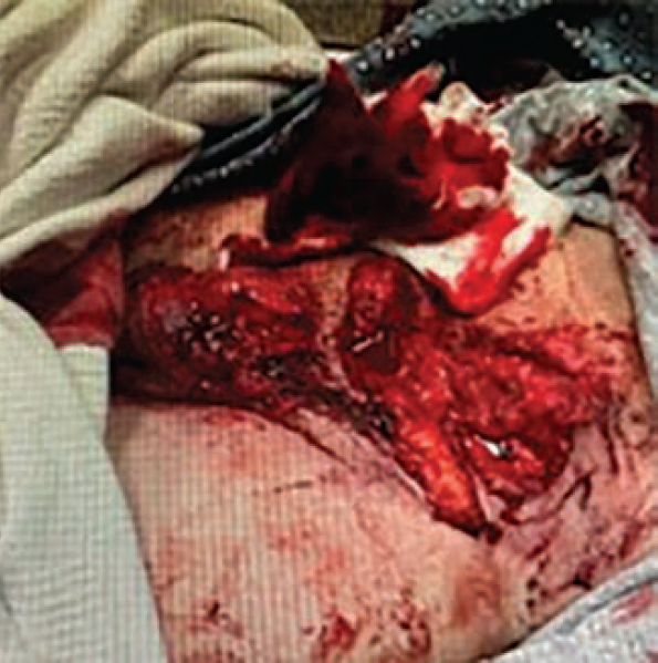 Tourniquets were placed and tranexamic acid was administered. The preliminary laboratory values included a white blood cell count of 35.7 x 109/L, hemoglobin level of 14.2 g/dL, lactic acid of 7.2 mmol/L, and creatine kinase level of 788 u/L. Due to developing respiratory distress the patient was intubated in the trauma bay, fluid resuscitation was initiated, and the patient was immediately taken to the operating room for exploration (Figure 2).