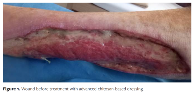 The current case details the effective use of chitosan-based dressings on a complex wound after unsuccessful attempts to achieve healing using conventional methods. The chitosan-based dressings were nonadherent, demonstrated antimicrobial properties, and maintained a moist wound healing environment that is beneficial for wound healing. In this case, use of the chitosan-based dressings resulted in complete granulation tissue formation within 10 days of application; whereas prior to receiving that dressing, the wound had been unsuccessfully managed with saline dressings for 4 weeks. This case showed early use of chitosan-based dressings may result in improved chronic wound healing outcomes.