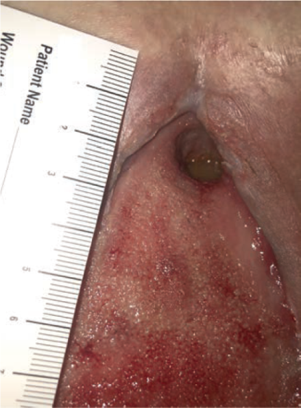 Despite adequate nutritional support and serial dressing changes, the fistula continued to leak bilious fluid during every NPWT dressing change, and there was no change in fistula size. The patient also reported chronic abdominal pain.