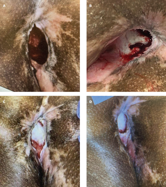 Initially, the wounds were treated with wet-to-moist dressing changes using antiseptic solution (diluted 0.125% strength Dakin solution) and then switched to daily calcium alginate silver dressing changes after cleansing with soap and water. During the treatments, it was noted that robust granulation tissue was not present. Instead, peripheral epithelium had advanced to cover the entire wound bed. In some areas, hyperkeratotic epithelium formed, which was then selectively debrided (Figure 2B, C). The wound was kept clean, with daily cleansing and applications of neutral petroleum jelly.