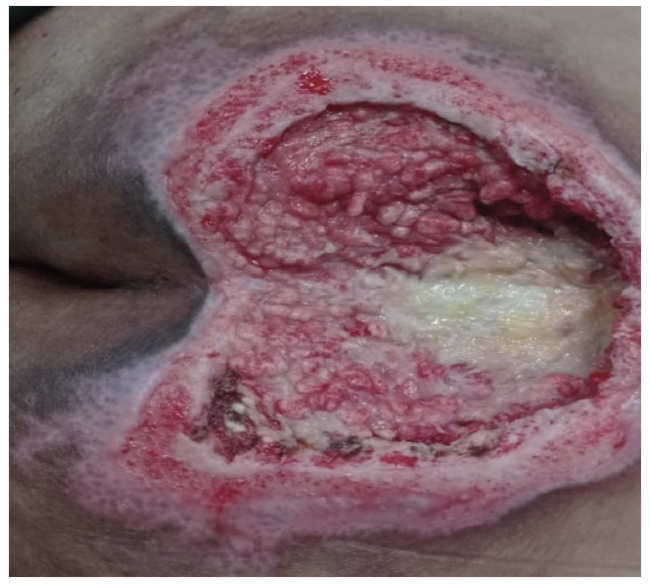 A 68-year-old male came to the outpatient clinic of Dr. Ramelan Navy Hospital, Surabaya, with a gaping wound in the sacral area. The patient also had a comorbidity of type 2 diabetes, which was controlled with oral antidiabetics. He was previously bedridden in the ICU for 2 months due to severe COVID-19 and started to develop an ulcer as a result, despite existing preventive protocols such as the use of a pressure-relieving mattress, bihourly patient repositioning, and application of skin moisturizer at high-risk areas twice daily. He then continued to develop lower extremity weakness, which rendered him to be only passively mobilized by wheelchair.