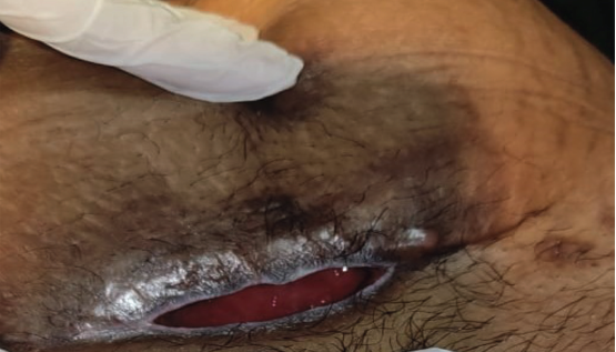 A 26-year-old female with no known comorbid conditions presented with a gaping Pfannenstiel scar 6 months after lower segment caesarean section performed at a peripheral hospital (Figure 3). The wound did not regress despite a standard regimen of antibiotics and debridement. Multiple sinuses and indurated areas containing odorless seropurulent fluid developed at the surgical site. A trial of negative pressure wound therapy was unsuccessful.