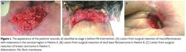 The autologous FM dressing demonstrated efficacy in healing recalcitrant oncologic wounds with no adverse effects nor the formation of hypertrophic scars. In Patient B, even without complete healing, the lesion showed scar tissue and edge closure. It is worth noting that before the FM treatment, all 3 wounds had remained open for more than 6 months even though the patients had been treated weekly with conventional therapy. Therefore, it is possible to say that, compared with conventional dressings, the FM is a lower-cost alternative that is easy to prepare and apply. These features justify the effort for continuing its clinical evaluation in chronic wounds, especially in immunosuppressed patients.