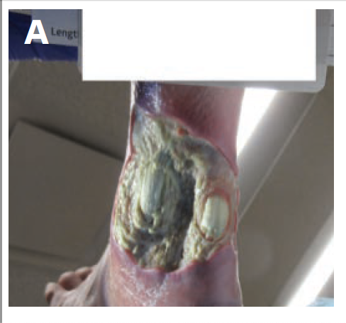 A male patient was referred to the wound clinic by another physician for a second opinion. The patient presented with a chronic nonhealing ulcer of the right lateral lower leg of 2 years’ duration (Figure 3). Previous workup for the ulceration included 2 tissue biopsies that tested positive for acute and chronic inflammation, as well as peripheral arterial angiography, which was unremarkable. Two previous attempts to manage the wound with multilayer compression wraps were unsuccessful.