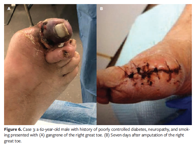 A 62-year-old male cigarette smoker with a history of poorly controlled diabetes and neuropathy presented with gangrene limited to the great toe secondary to aggressive anaerobic infection. He was admitted to the hospital and placed on intravenous antibiotics, after which amputation of the toe was performed (Figure 6). Just prior to closure of the dorsal and plantar flaps, microfilm matrix was applied to the subcutaneous tissue surface and flaps were closed over the matrix by primary intention using 3-0 nylon sutures with a ¼-inch plain packing strip applied to allow for appropriate drainage. Gauze dressing was applied, and the patient was fitted with a postoperative shoe with reduced weight-bearing and elevation of the surgical site. Sutures were removed 3 weeks postoperatively, and the patient was transitioned to diabetic shoes with custom inserts, including a great toe filler. Wound healing was achieved in 29 days. The patient reported no complications in the 3-month follow-up period.