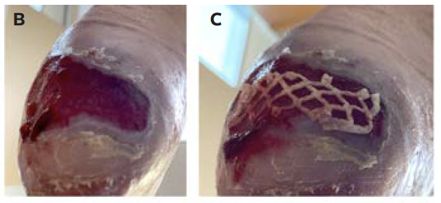 Both patients were refractory to standard care and were elevated to advanced wound therapies after approximately 1 month. Initially, DHACM (EPIFIX; MIMEDX Group Inc.) was cut and applied to fit the wound as appropriate. Wounds were considered stalled for the 2 patients in the current report if 50% closure was not achieved after 1 month to 5 months, at which time DHUC (EPICORD; MIMEDX Group Inc.) was used. The DHUC was rehydrated for approximately 10 seconds in a saline bath. The limited size of umbilical tissues has resulted in approaches to maintain its effectiveness over a larger area, including meshing, a strategy often used in skin grafting. The DHUC EX was cut to fit the desired area after rehydration of the product. A nonadherent contact layer was placed over the allograft, followed by appropriate moisture management dressings.