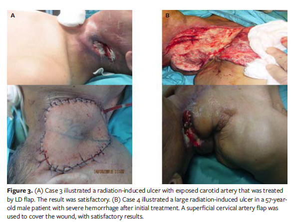 Patients with RT-induced severe ulcers, including ulcer bases with exposed carotid artery, exposed trachea, exposed pleura, exposed pericardium, and exposed cheekbone, who presented to the Plastic, Reconstructive, and Regenerative Centre of the Viet Nam National Burn Hospital, Hanoi, Viet Nam, between October 2015 and September 2019, were recruited for this study. Surgical reconstruction was immediately required for all cases after meticulous physical examination. Appropriate surgical techniques were chosen based on the surgeons’ experience and the defect characteristics of the individual patients. Patients signed a consent form permitting use of their information for this publication.