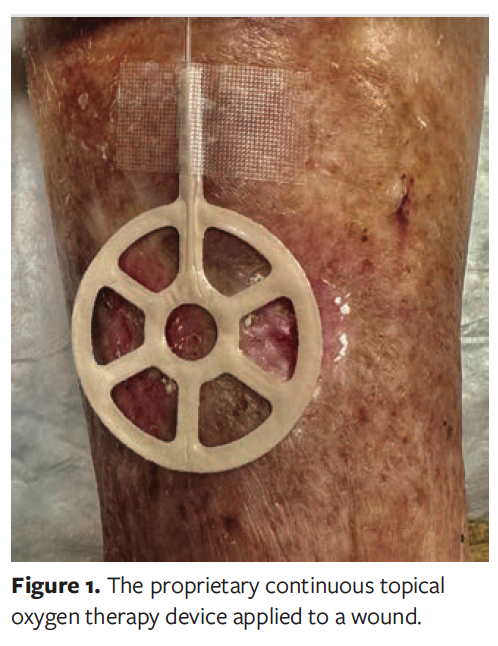 cTOT has been reported to support faster healing versus standard of care across multiple studies and wound types,16-23 and this therapy provides the added advantage of wound pain reduction24 and patient mobility during treatment.15 The cTOT device used in the current case series proved to be an innovative, easy-to-use, lightweight appliance for delivering continuous oxygen directly to the wound bed through a long, thin, flexible tube connected directly to the cell phone–sized portable oxygen generator. The web-like wound interface of the oxygen delivery system permitted wound exudate to pass through to the secondary dressing, thereby maintaining a moist wound base without maceration. The cTOT device is portable; thus, oxygen delivery was maintained 24 hours a day, 7 days a week, allowing the patients to continue to perform activities of daily living uninterrupted. The treatment has been validated as low-risk, and it is easy to use in a wide range of care settings and for a variety of chronic wound types.15,25