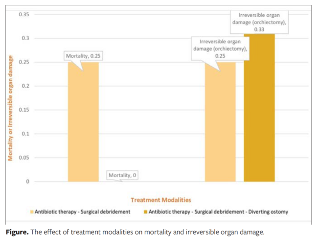 In a previous study, 86 cases of FG were identified during the same period (between January 2010 and December 2018), with 20 deaths (23.3%).6 Of these 86 patients, 4 had a hematologic malignancy and perianal infection was the leading precipitating event causing FG. One of the 4 patients died of overwhelming sepsis (25%). In 1 patient, orchiectomy was inevitable owing to necrosis (25%). The effect of treatment modalities on mortality and irreversible organ damage (orchiectomy) is shown in the Figure. All 4 patients were male, with a mean age of 36.75 years ± 13.1 (range, 23–52 years). Fournier’s gangrene was diagnosed approximately 8.75 days ± 6.94 (range, 3–17 days) after onset of anal pain and 13.5 days ± 12.2 (range, 3–31 days) after onset of fever. The mean length of hospitalization was 45.75 days ± 24.25 (range, 23–78 days).