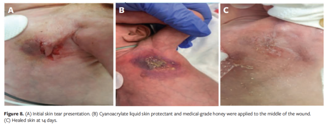 The current study supports the efficacy of CSP against moisture-associated skin damage seen in an ostomy and gastrostomy-associated dermatitis, peritracheostomy maceration, incontinence-associated dermatitis, and allergic contact dermatitis. Cyanoacrylate liquid skin protectant suppresses granulation tissue growth, likely by to diminished friction and allowing healing. In addition, progression of skin tears (Figure 8) and epidermal stripping were halted with 1 application of CSP. Challenging denuded and moist wounds resulting from various illnesses can benefit from the drying effects of CSP as demonstrated by improvement in difficult-to-manage GVHD lesions. The patients in the current study represented various ages, from preterm neonates with fragile, underdeveloped skin to extremely immunocompromised teenagers with multiple lesions affecting their body image and quality of life. Neonatal and pediatric pain scale scores reflected comfortable application of CSP, and older patients confirmed a lack of stinging, burning, or pain.